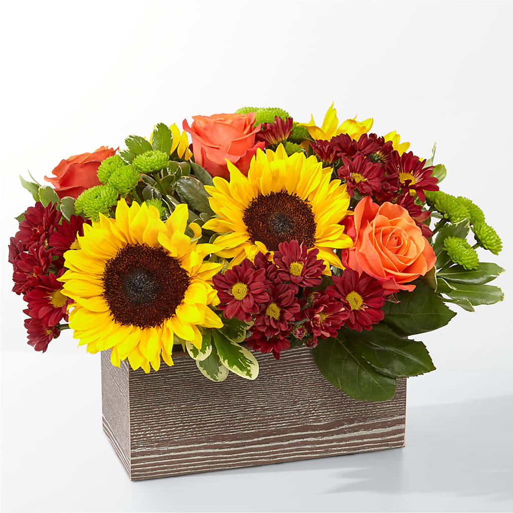 Delight your friends and family with an assortment of bright Autumn colors in a rustic, textured container.